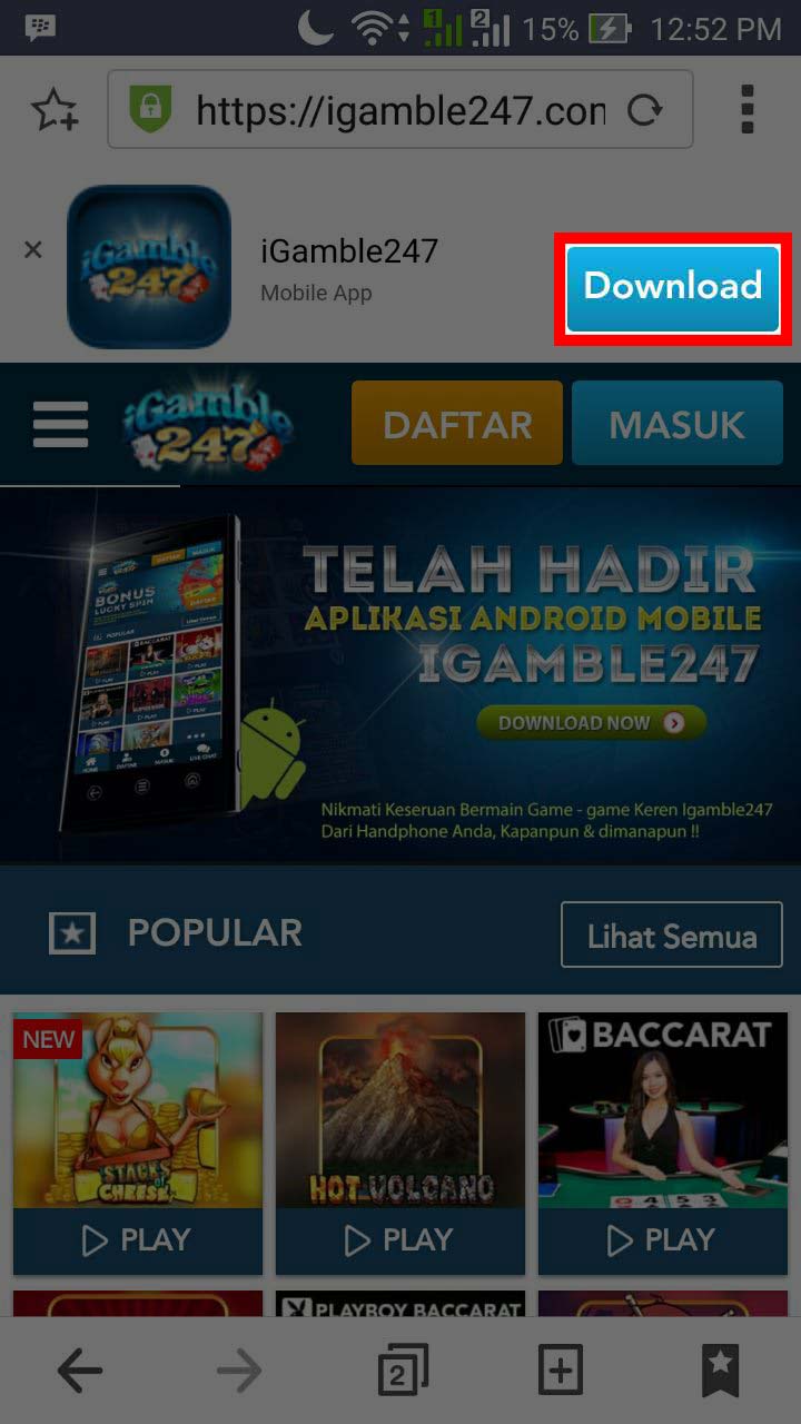 1. Masuk ke menu Browser Mobile anda dan Kunjungi www.Igamble247.com setelah itu klik menu MOBILE lalu klik button Download Now, dan tunggu proses download selesai.